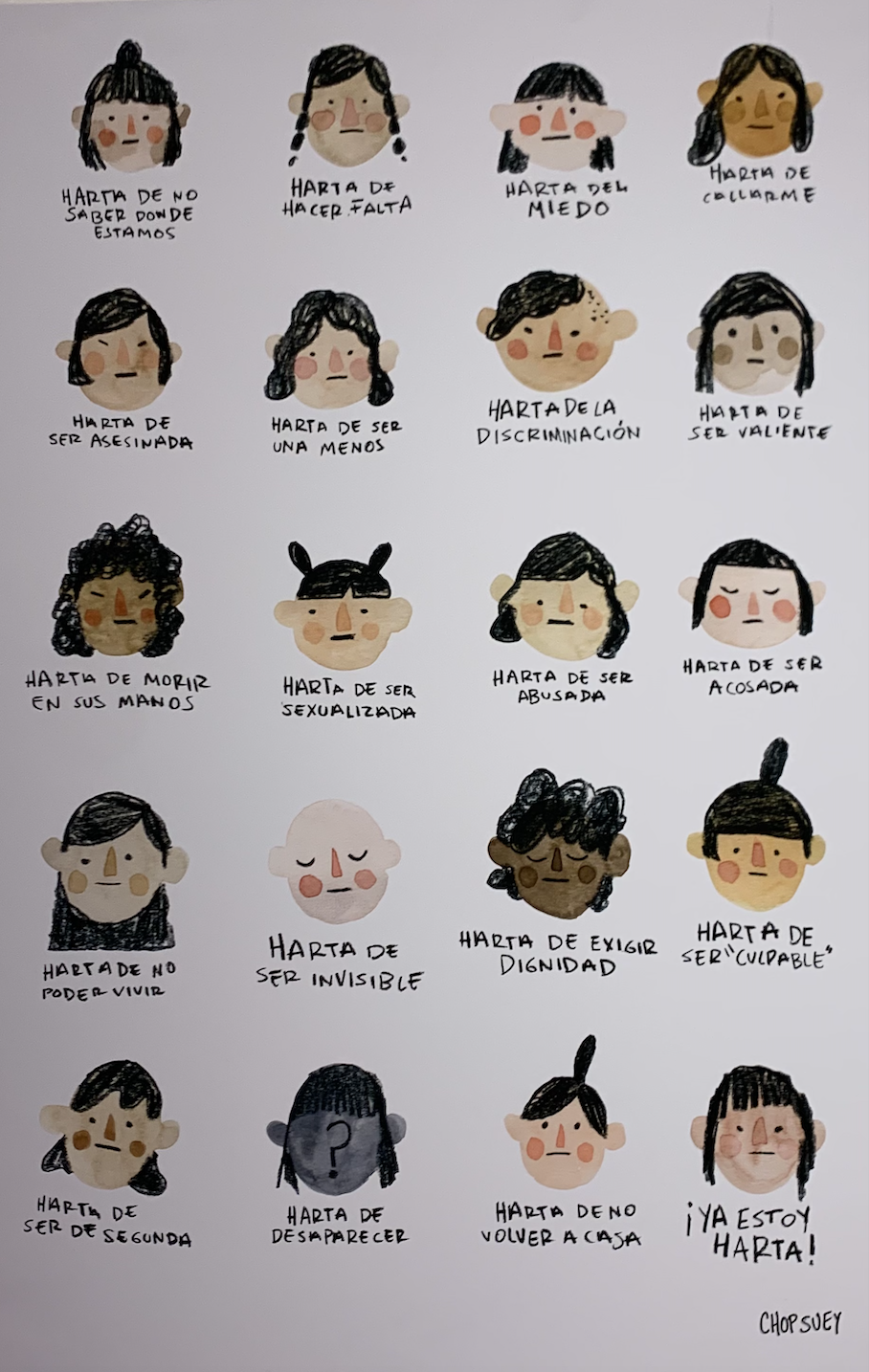 This image depicts different Mexican women's thoughts including "I am tired of being afraid," "I am tired of being quiet," "I am tired of being brave," "I am tired of being abused," "I am tired of being sexualized," "I am tired of being invisible," "I am tired of not returning home," and "I am tired!"